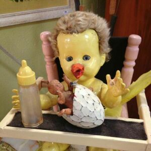 I remember when my daughter was about...four, and my son was about 2, she gave him this dark look. He chewed off the head of her favorite cat doll.
