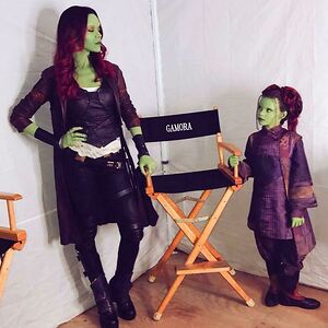 Zoe Saldana (Older Gamora) And Ariana Greenblatt (Young Gamora) Behind The Scenes Of Avengers Infinity War