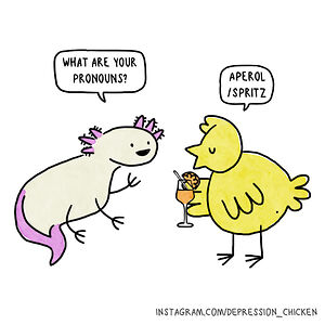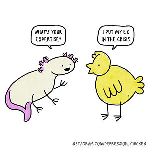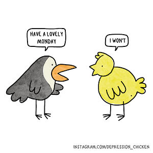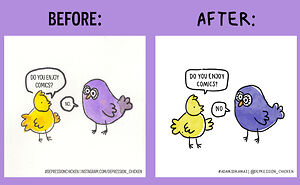 I started with comics to better represent how I feel and to deal with my depression. My protagonists are Depression Chicken and his buddys Birdfish and Aleksiklotl and many others.