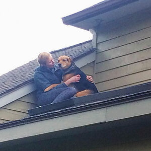 Somehow Our Dog Opened The Upstairs Screen Door And Ended Up Following Our Cat Onto The Roof. He Required Consoling Before Coming Back Inside