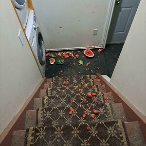 Rearranging Fridge, Watermelon Rolled Out. I Ignored Thinking I'd Grab It In A Second. It Continued To Roll Down The Nearby Staircase