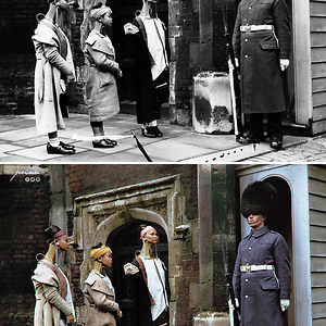 Giraffe Women Looking At A Guard, Posted At St. James's Palace 16th Century Main Gate, During Their Visit In London, 1935