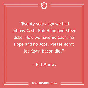 “Twenty years ago we had Johnny Cash, Bob Hope and Steve Jobs. Now we have no Cash, no Hope and no Jobs. Please don’t let Kevin Bacon die.” — Bill MurrayShow All 19 Upvotes