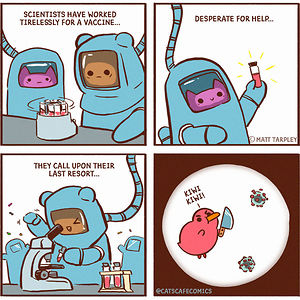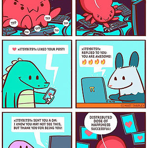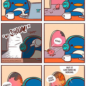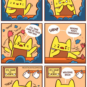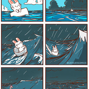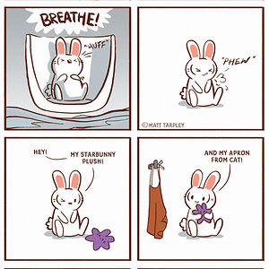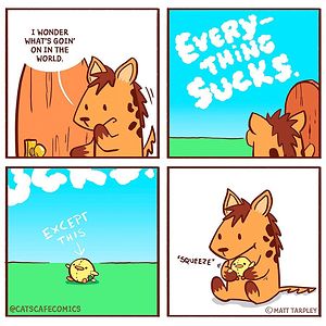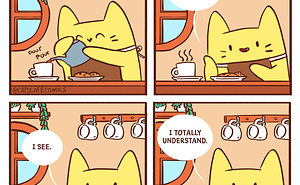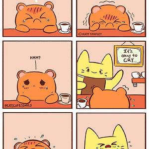 Cat's CafΓ©, a webcomic created by Matt Tarpley, tackles the experiences of life one cup of coffee (or tea!) at a time. Starring Cat (the owner of the cafe), Rabbit, Penguin, and slew of other cute animals, Cat's CafΓ© approaches important topics such as anxiety, diversity, and inclusion with a wholesome touch.