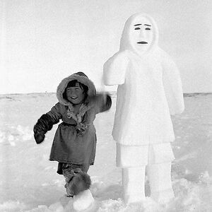 Richard Harrington: Theresie, Three-Year-Old Daughter Of Erkuaktok (Iquugaqtuq), A Pelly Bay (Arvilikjuaq) Inuk, Standing Next To A Snowman Carved By Her Father, 1951