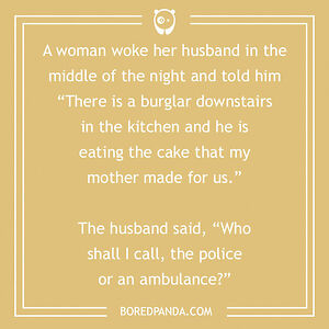 A woman woke her husband in the middle of the night and told him “There is a burglar downstairs in the kitchen and he is eating the cake that my mother made for us.” The husband said, “Who shall I call, the police or an ambulance?”This Panda hasn't followed anyone yet