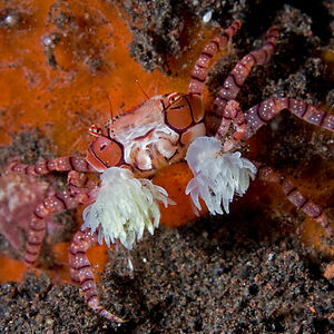 Boxer crabs/pom pom crabs keep sea anemones on their claws in a mutualistic symbiotic relationship