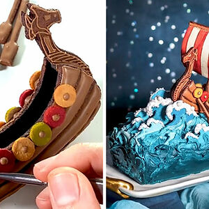 The Making Of My Recent Vikings-Themed Swiss Roll Cake. Vanilla Cake Filled With Apple Compote And Walnuts, Decorated With Cream Cheese Frosting And Cinnamon-Almond Cookies