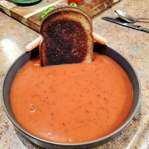 We Ran Out Of Regular Bowls And Plates, And This Was The Only Way To Set Up The Grilled Cheese. He Reminded Me Of A Hot Tub So I Added Arms