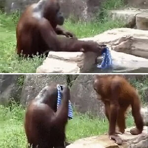 This Is Dawn The Orangutan. She Saw Zoo Workers Cleaning Off After A Shift. So Dawn Stole A Cloth And Now She Cleans Off Everyday Too