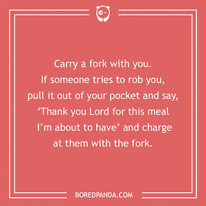 Carry a fork with you. If someone tries to rob you, pull it out of your pocket and say, ‘thank you Lord for this meal I’m about to have’ and charge at them with the fork.Show All 17 Upvotes