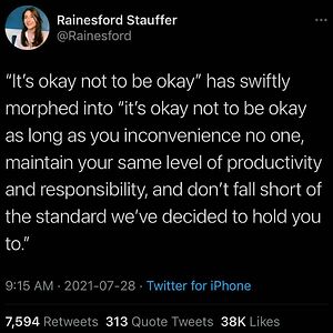 This…how Did We Get To This. We Are On The Path To Normalization Of Conversations About The Topic But If It Makes Someone Uncomfortable Or Inconveniences Someone Then It Feels Like The Conversation Hits A Wall. This Is So Frustrating And I Hope It Changes Soon…we Need More Awareness Over This Part Of Mental Health. - @tanner_hamilton22 . . . . . 📸 = @rainesfordstauffer On Twitter . . . . . #mentalhealthfirst #mymentalhealthjourney #mymentalhealthmatters #mentalhealthawareness #mentalhealthmememes #anxiety #depression #keepgoing #yougotthis #asafeplaceinsideyourhead #itsokaytonotbeokay #itsokaynottobeokay #normalizementalhealth