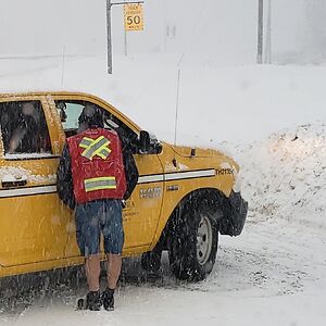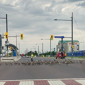 Huge Respect For This Guy (Working At A Construction Site) Who Helped A Huge Flock Of Geese Cross The Busy Street
