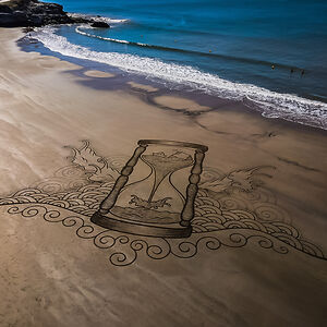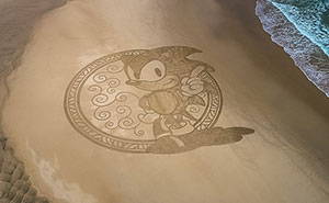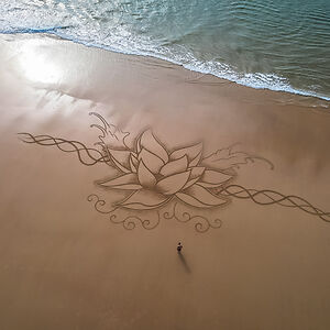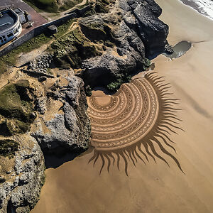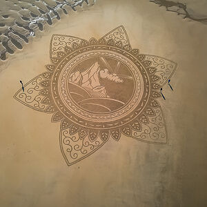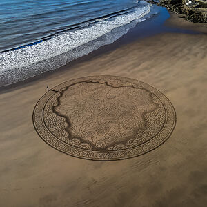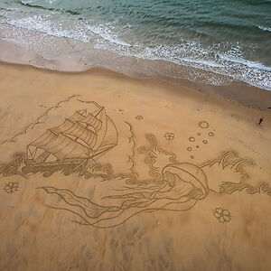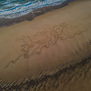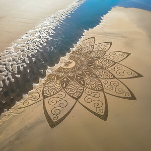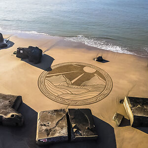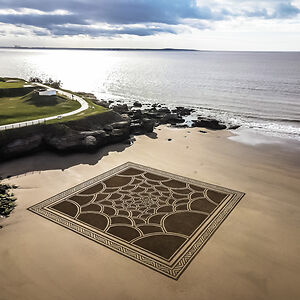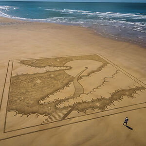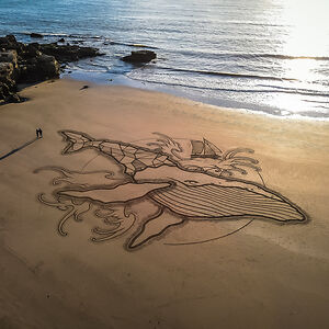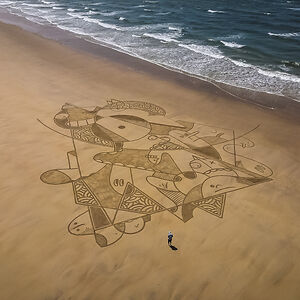 Beach Artist drawing on the sand at low tide since 2013.