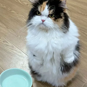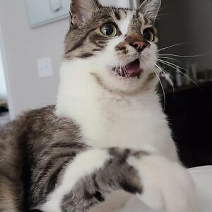 I pulled into my driveway after a trip to the vet to pick up the ashes of a grey and white piebald tabby who left us the week before. Only to find a severly malnourished grey and white piebald tabby on my doorstep, crying for help.