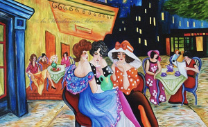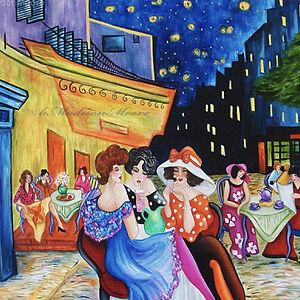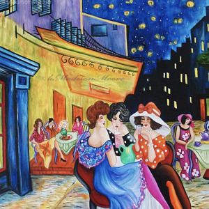 I enjoy reading researching a famous piece of work like van Gogh’s Cafe Terrace at Night for example. At the same time I was maybe also checking out some facts about Tarkay or Gauguin. Then the magic suddenly happens I see a composition reimagining Tarkay’s Ladies sitting at Vincent’s Cafe on a girls night out. A painting is created and a vision is completed. The title is Tarkay Visits van Gogh's Cafe Terrace at Night.