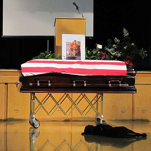 Labrador Retriever Hawkeye Lays By The Casket During The Funeral Of His Owner, Navy SEAL Jon Tumilson