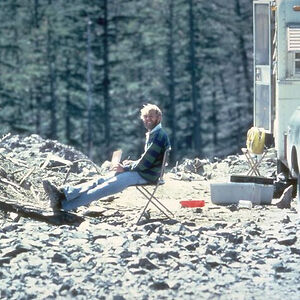 In the photo is David A. Johnston, star vulcanologist for the United States Geological Survey, camped at his trailer at his field post.