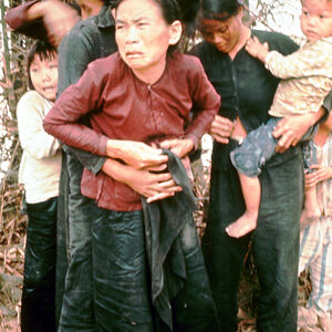 The my lai villagers picture. might not fit exactly since the picture shows the terrorized villagers right before they were gunned down, so not exactly seemingly normal. but, one often overlooked aspect is the young woman buttoning her shirt, which is interpreted as evidence that she was r***d right before the photo.