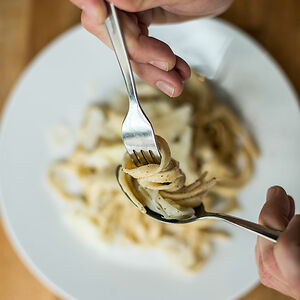 Italy - using a spoon to help you twist spaghetti around a fork