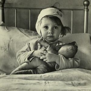 A Brave Little 3-Year-Old, Eileen Dunne, Sits In Bed With Her Doll At Great Ormond Street Hospital, After Being Injured During An Air Raid On London, During The Blitz Of London By The Luftwaffe, In September, 1940