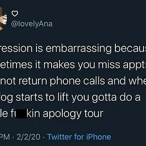 Ugh This Apology Tour Happened At Least Twice A Month For Me. This Hit Home For Me, It May Not Hit Home For Everyone But Damn I Low Key Hate Telling People I’m Depressed Sometimes, It’s Like Do They Even Care Or Will They Even Listen. I’ve Gotten A Lot Better Over The Years Finding Mental Health Support And Love And Trust But I Used To Never Show Up To Things I Committed To. Guess We Can Call It Growth Lol. -Tanner . . . . . . . #anxiety #depression #howcanwehelp #youareamazing #asafeplaceinsideyourhead #thisisawesome #itsalllove #mentalhealthawareness #mentalhealth