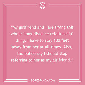 My girlfriend and I are trying this whole "long distance relationship" thing. I have to stay 100 feet away from her at all times. Also, the police say I should stop referring to her as my girlfriend.