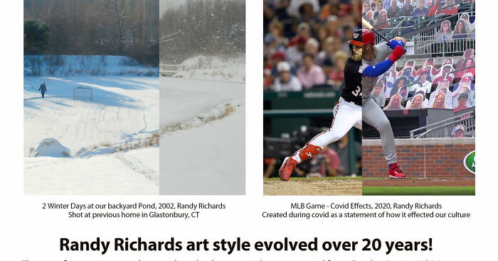 My art is a result of over 20 years of hard work and dedication to this style. I take photos of the same scene at different times from the same exact vantage point. This allows the viewer to travel in time between seasons, different years or even different times of the same day. I also combine in focus and out of focus images of the same scene. Using the cube creates an altered sense of reality - a 4th dimension if you will. I have been creating these since 2002 and have had shows in CT and NYC galleries and museums. This style evolved out of paintings done between 1996 and 2002 and first started digitally as side by side images and collages in 2002 and quickly became 3D cubes that same year. I still produce side by side pieces occasionally as well.In addition to using Photoshop for my job as creative director commercially and producing digital art on BIC Pens distributed nationally in 1990, I have also been using the application since 1990 - the first year it was available and created some of the very first digital fine art pieces ever done with Photoshop.See more at instagram.com/randyrichards5
