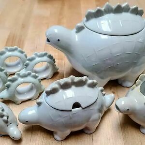 Behold! My Precious Stegosaurus Teapot, Cream And Sugar, Salt And Pepper, And -- Most Fabulous And Impressive Of All -- Napkin Rings! All I Need Now Are The Stegosaurus Mugs. Are They Not The Cutest?