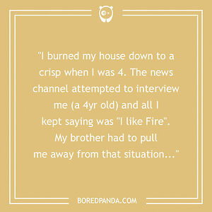 "I burned my house down to a crisp when I was 4. The news channel attempted to interview me (a 4yr old) and all I kept saying was "I like Fire". My brother had to pull me away from that situation..."