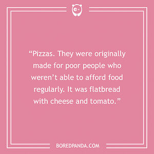 “Pizzas. They were originally made for poor people who weren’t able to afford food regularly. It was flatbread with cheese and tomato.”Show All 5 Upvotes