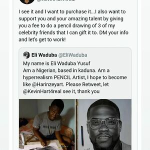 In 2019, 26-Year-Old Nigerian Artist @eli_waduba4real Tweeted A Portrait He Did Of @kevinhart4real . eli Had No Doubt That His Favorite Comedian Would Reply. Not Only Did Kevin Hart Reply But He Also Commissioned His Work. this Week @goodnews_movement Spoke With Eli This Week And Eli Says His Life Changed From That Point Receiving More Commissions & Helped Him To Become An Artist Full-Time. 🎨 🙌 Never.give.up.
