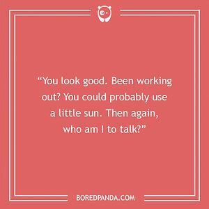 “You look good. Been working out? You could probably use a little sun. Then again, who am I to talk?”