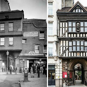 The Changing Face Of St Bartholomew-The-Great's Gatehouse In Smithfield, Which Was Built In 1595 And Some Point Bricked Over. It Was Bombed During A Ww1 Zeppelin Raid Knocking Off Some Bricks Revealing Its Tudor Half-Timbered Facade. It Was Restored To How It Looks Today. 1916 vs. Now