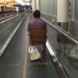 My Buddy Spotted This Guy At The Airport On The Moving Walkway, Sitting In A Chair, Eating McDonalds While Catching Pokemon