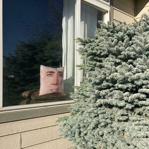 For Weeks We’ve Been Having Issues With A Bird Flying Into This Window. My Daughter’s Nicolas Cage Pillow Solved The Problem