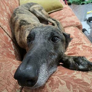 Meet Potato, The Largest Greyhound Ever; He Is Getting Old And I'm Sad About It. He's Around 10yr And Has A Spinal Injury, Worn Teeth And A Sore Groin Tendon From His Abusers Before We Rescued Him. Everyone Send Him Good Vibes, He Really Needs It