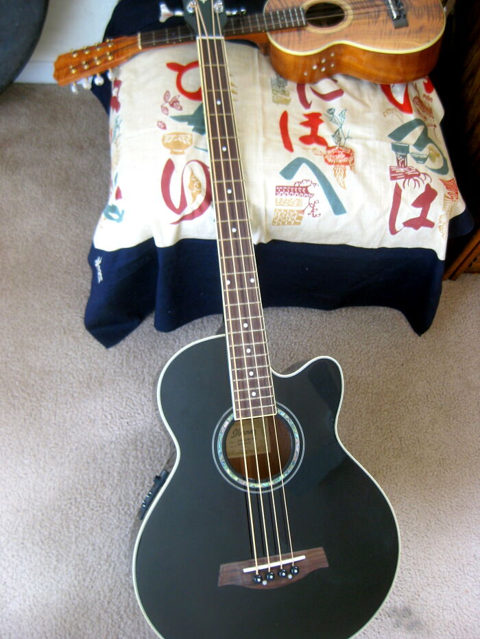 That's a picture of a 4 string acoustic bass in the foreground. Cant tell if the controversial instrument is the one in the background. Kinda sounds like they have an 8 string bass.