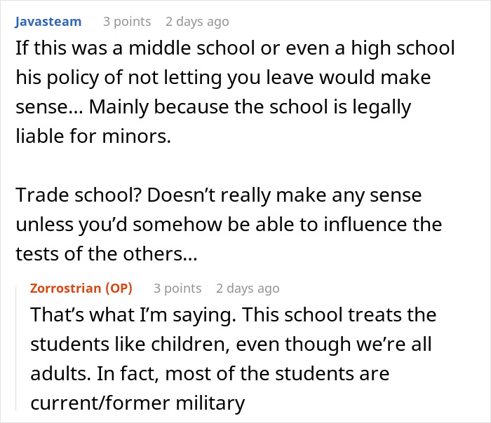 u/Zorrostrian, the original poster and trade school student with a killer attendance, recently had a bunch of finals, including an online one, a written one, and a quiz retake!