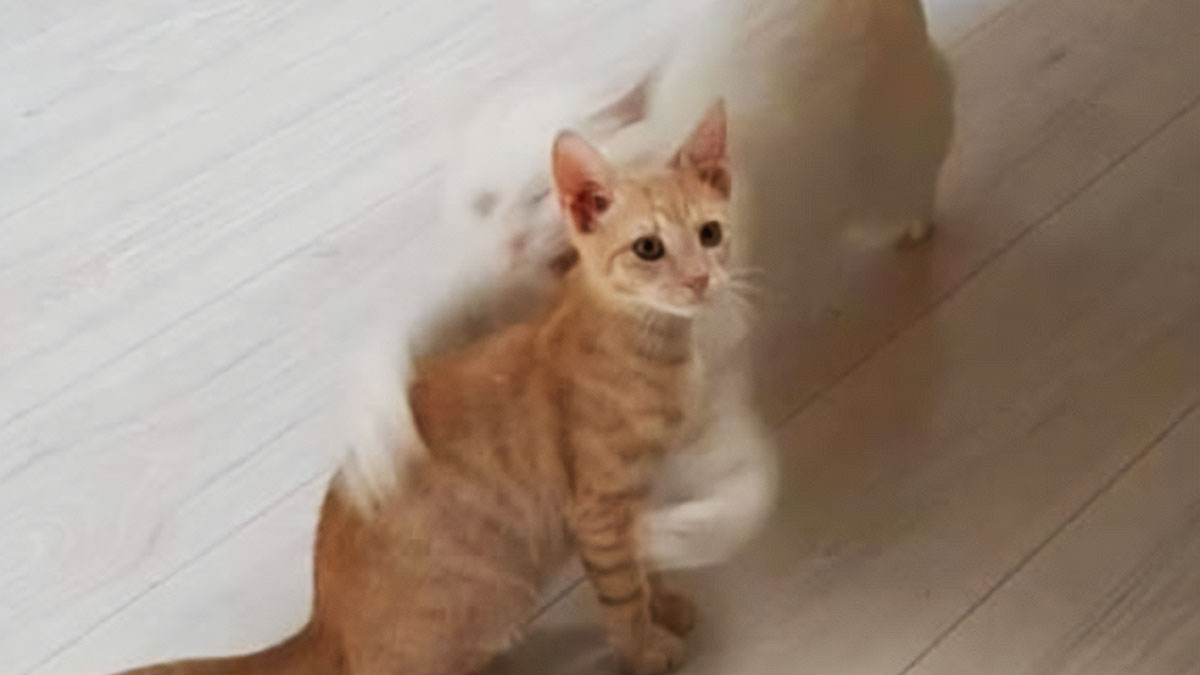 Funny cat memes showing an adorable kitten growing into a fluffy cat, captured in two side-by-side photos.