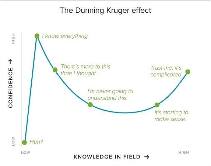 This what millions of antivaxers are experiencing right now. They feel informed because they did internet research. Or because they are a nurse. Or because they know someone who backs up their opinion. They don't even know how much they don't know. To me, the scariest part of being in the US right now is how willing people are to take their opinion as a fact and use groupthink as a form of confirmation. Thousands of people who studied the subject for 8 years and currently work in the field are saying one thing while the other side has Timmy, the YouTube video maker talking to a guy that used to work at company and got fired is saying another. And somehow the thought process is the video is right. That is scary
