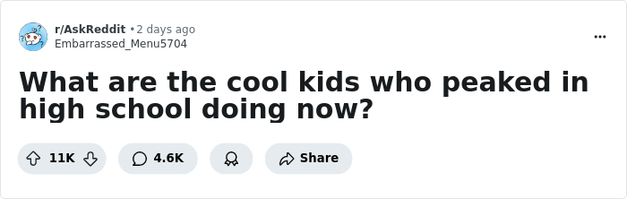Reddit user Embarrassed_Menu5704 tells Bored Panda that what led him to start this discussion was his curiosity about whether the people who peaked in high school were able to leverage the strong social skills and networks they usually have.