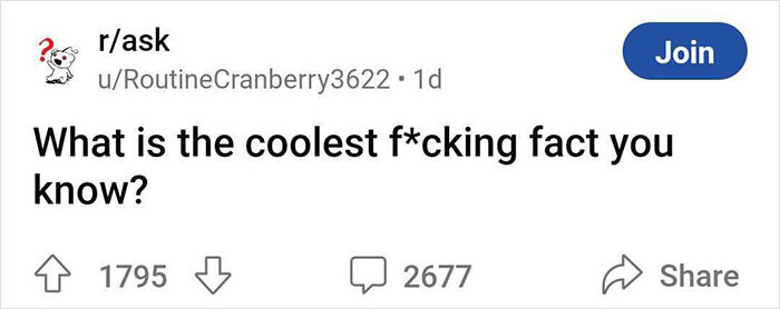 Someone asked, “What is the coolest [freaking] fact you know?” and people from across the internet shared their best bit of lesser-known information about the world. So get comfortable, scroll through, upvote your favorites, and comment your own examples below.