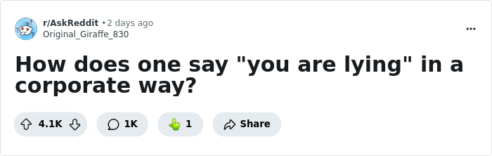 Just a couple of days ago, a thread appeared in the AskReddit community, the author of which, the user u/Original_Giraffe_830, asked netizens the question: "How does one say 'you are lying' in a corporate way?"