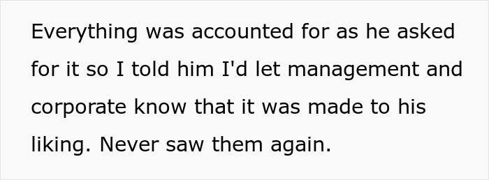 In essence, everything was done exactly as he had requested; therefore, the woman stated she would inform her management and corporate that everything had been done to his satisfaction. The two were not seen again.