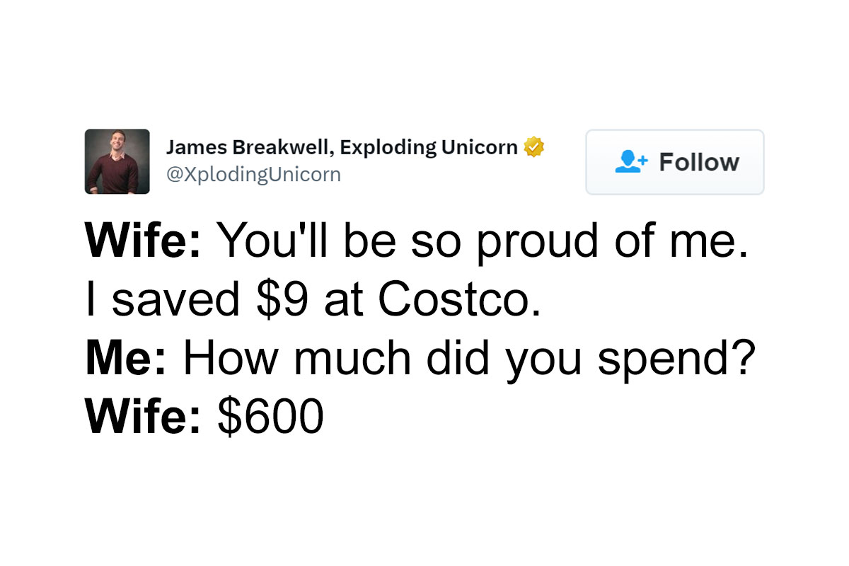 HUSBAND: You'll be so proud of me. I saved $9 at Costco. WIFE: How much did you spend? HUSBAND: $600. I'm so tired of the old view of women spending men's money. WE WORK our asses off.