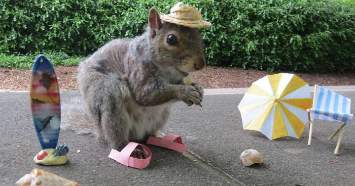 “I’m a huge animal-lover,” Krupa says in a YouTube interview “…when I saw that the squirrels here are really so friendly to let you touch them, I figured, hm, well if the squirrel lets me touch it, maybe I can put a little hat on it.”