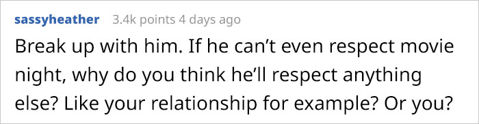 People in the comments were pretty unanimous with their decision. They found the guy being disrespectful and selfish. A lot of users even agreed that they should break up because if he doesn’t take into consideration such small but clearly important things to his girlfriend, how their relationship can evolve into something more serious.
