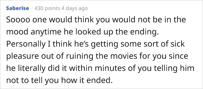 The couple decided to have their movie Thursdays as usual after the boyfriend (who the user called Andy) promised that he would not try to find the movie spoilers on the Internet. Some people might think that maybe there is nothing wrong with wanting to know something in advance, but the thing that triggered the narrator the most was that she didn’t want to know the end of the movie until she saw it herself. However, the boyfriend would spoil it for her too even after she explicitly told him not to do it.