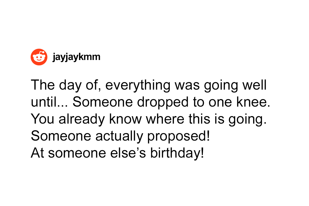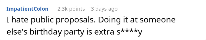 Load More Replies...Meh. It would have been better to just ignore the couple and have their big proposal fizzle out, and just continue with celebrating the birthday girl. It's only a big deal if you let it be a big deal.